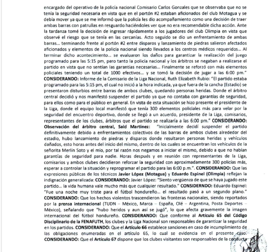 Por lo tanto, la Comisión de Disciplina determinó sancionar a Motagua jugando sus próximos tres partidos fuera de Tegucigalpa, mientras a Olimpia jugar sus próximos dos encuentros fuera de la capital.