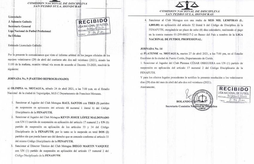 La Comisión Nacional de Disciplina dio a conocer las sanciones para los dos jugadores del Motagua que fueron expulsados y al entrenador Diego Vázquez.