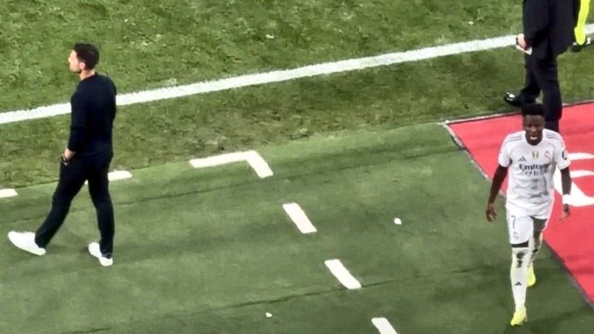 Cuando las cámaras enfocaron a Xabi Alonso, quien miraba para otro lado, dijo un “venga, Vini, hostias”, y ninguno de los dos interaccionó en el cambio.
