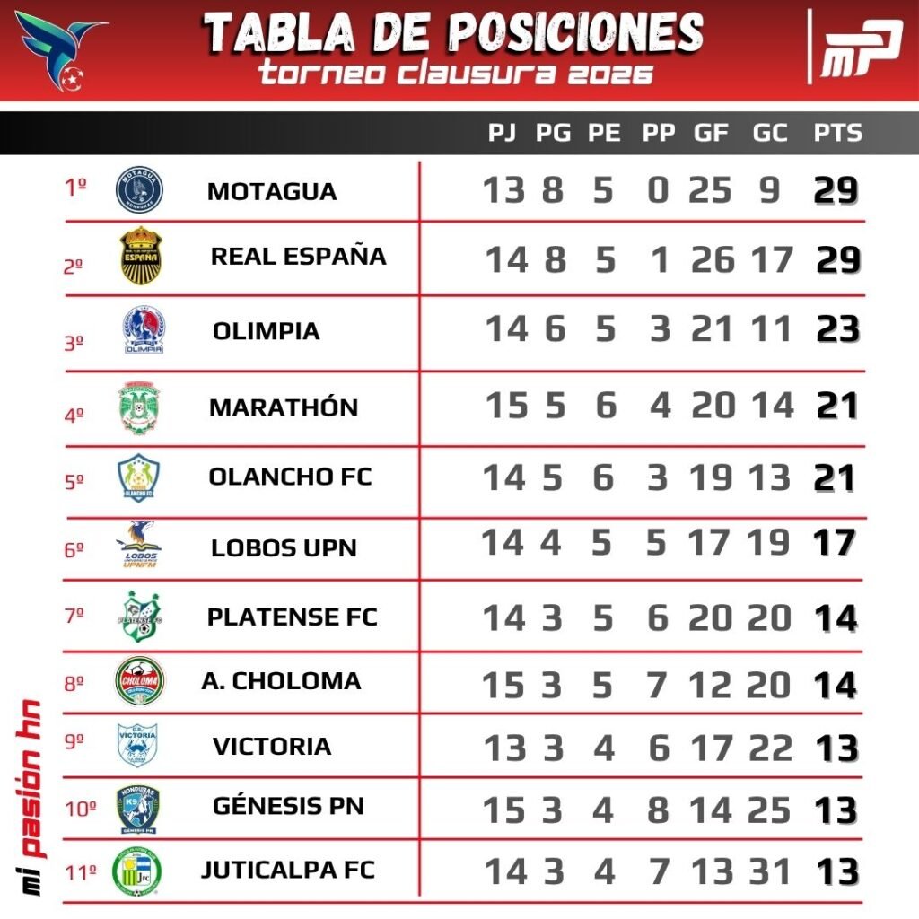 El tercer lugar es para Olimpia con 23 puntos, mientras Marathón es cuarto con 21 puntos, seguido de Olancho FC con igual número.