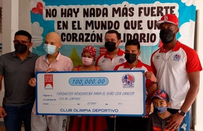 Una representación del plantel de los leones encabezada por Michael Chirinos, Jorge Benguché y el ex delantero Carlos Will Mejía, entre otros, entregaron el donativo de 100 mil lempiras a la Fundación Hondureña para el Niño con Cáncer.