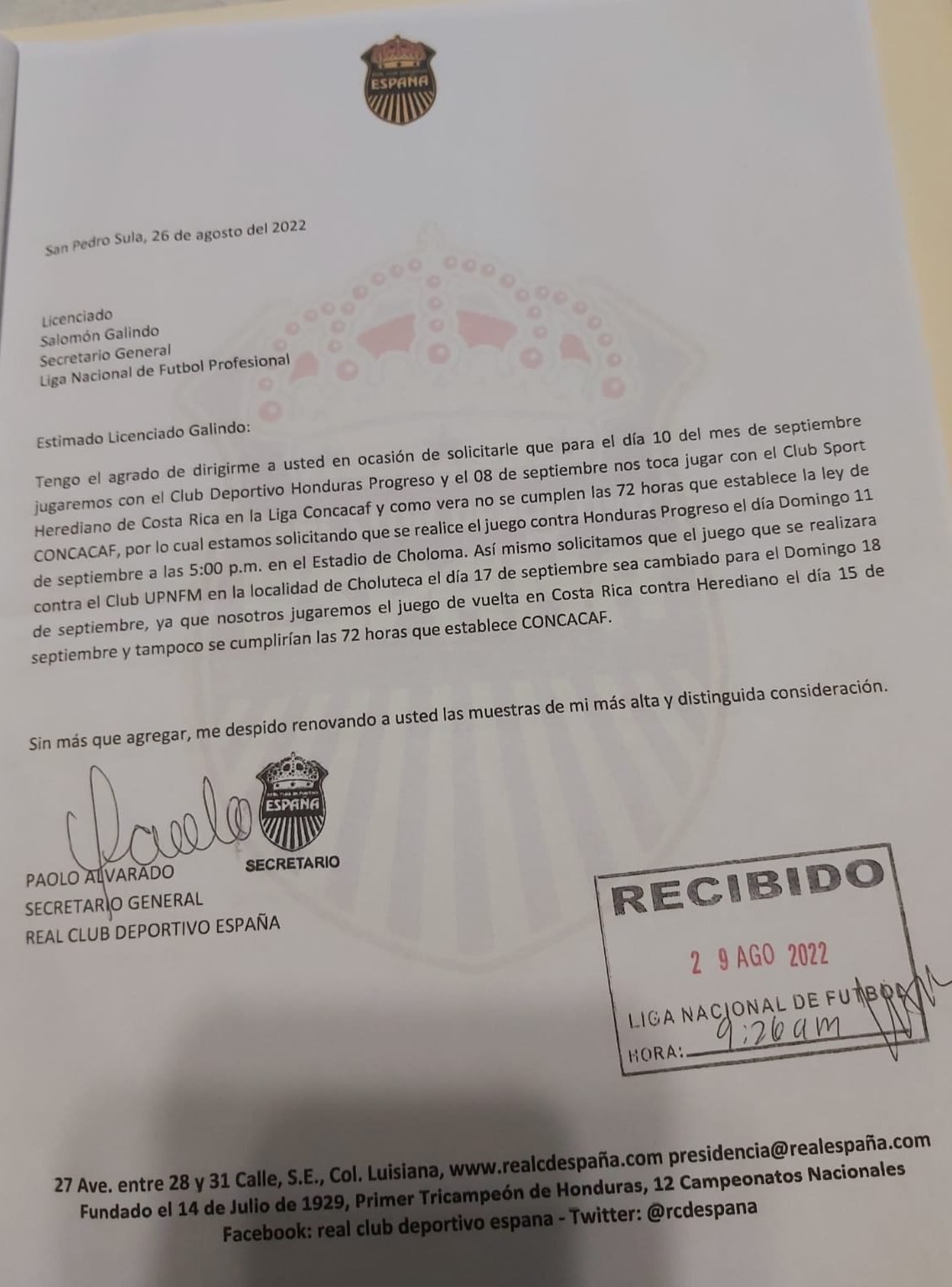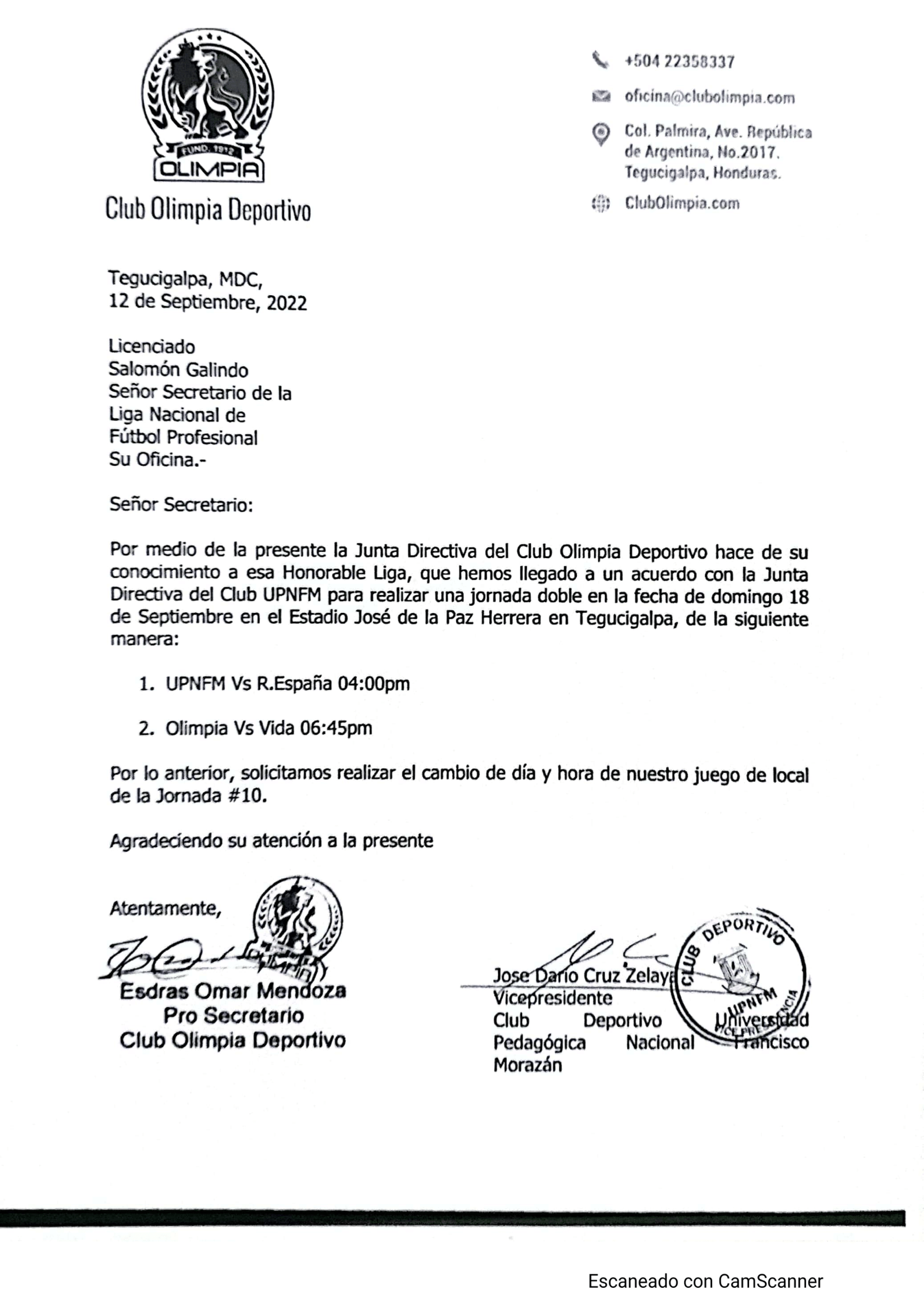 La solicitud indica que el primer partido de la jornada será el de lobos de UPN ante Real España a las 4:00 de la tarde.