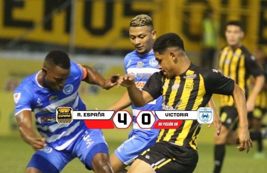 Real España esta ganó 4-0 al Victoria en el estadio Morazán de San Pedro Sula. con ese resultado, fue apliza la que los aurinegros aplicaron a los ceibeños en la segunda parte del debut en este Torneo.