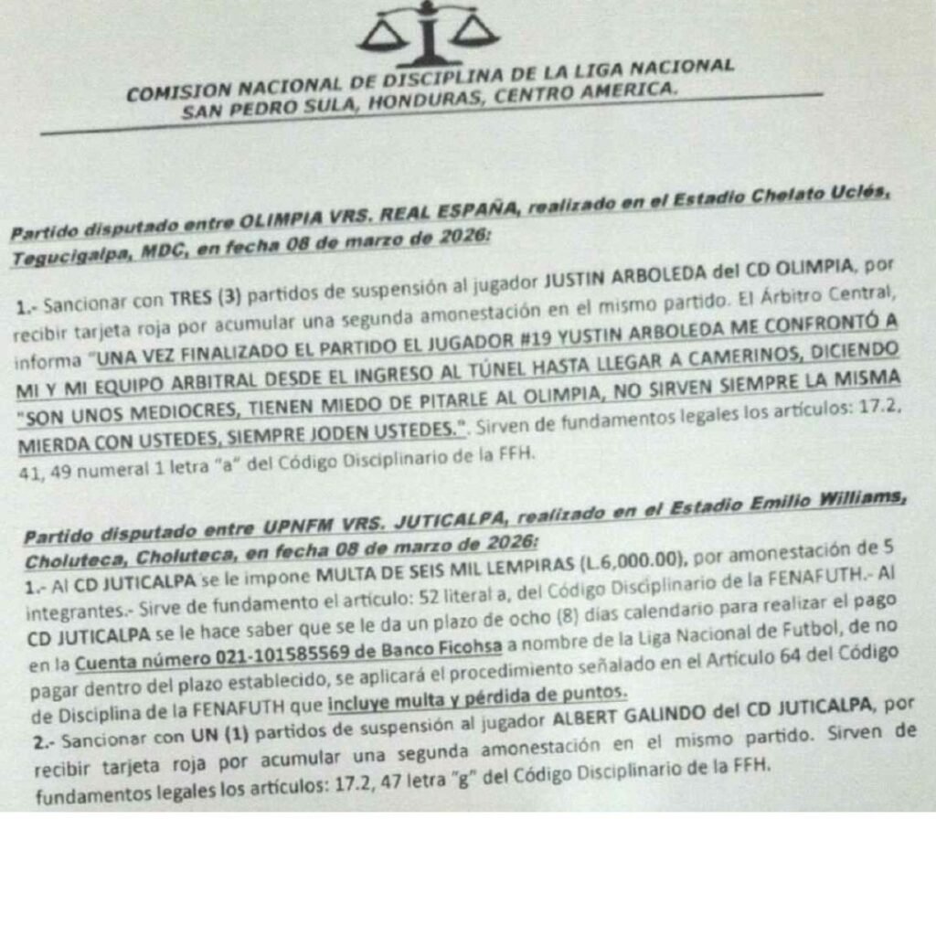 Asimismo, multas se seis mil lempiras a los equipos Choloma y Juticalpa FC por recibir más de cinco tarjetas amarillas.
